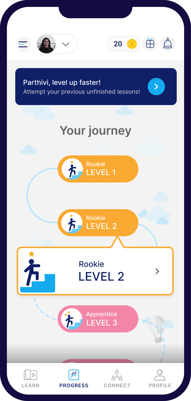 The progress tab provides a clear visual representation of a learner’s journey across levels, making progress tracking engaging and motivating. Interactive elements with smooth animations create a sense of achievement and momentum, reinforcing the habit-building process.