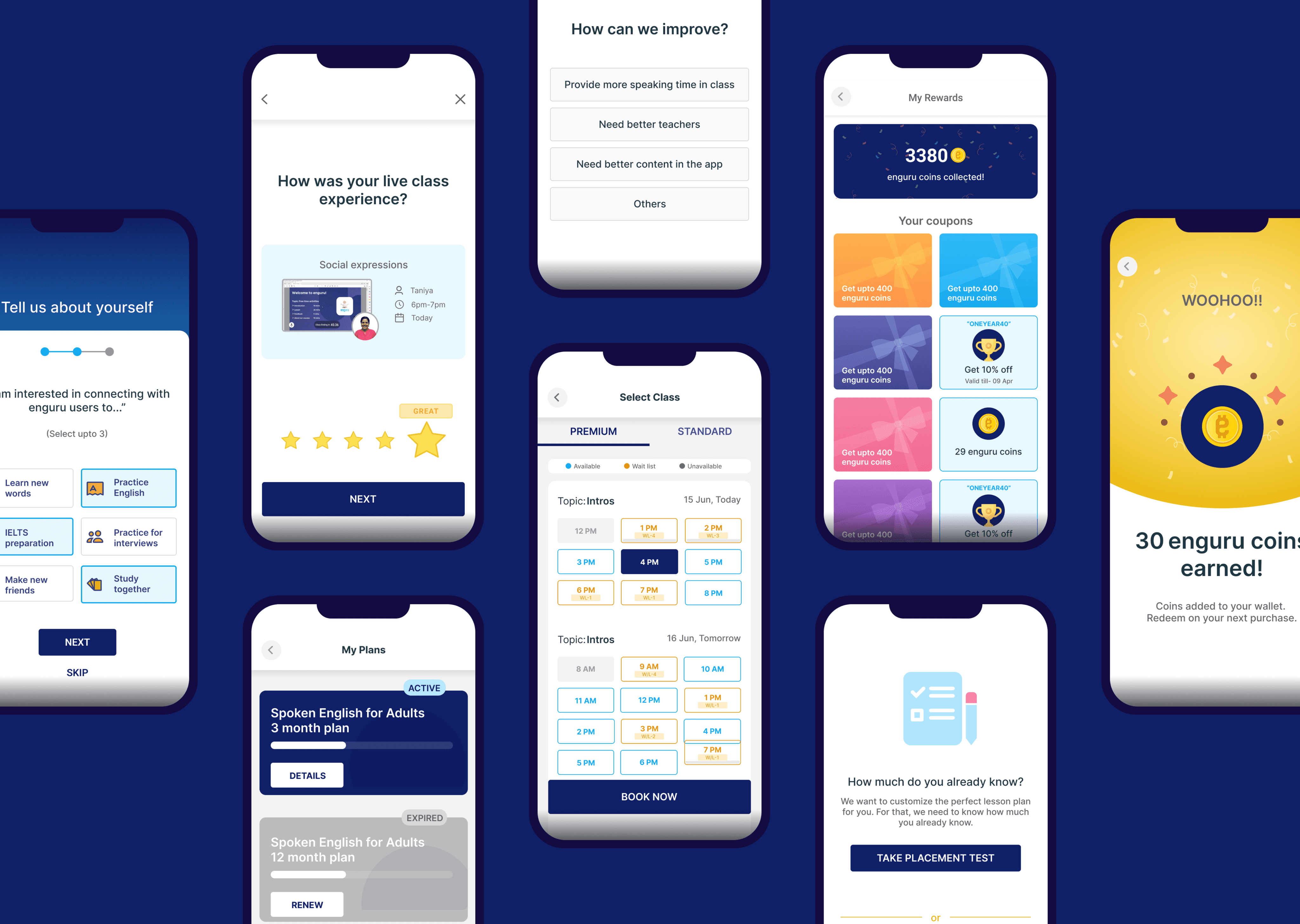 The business teams wanted better conversions since the numbers had stagnated. Our teachers noticed that students weren’t fully using the enguru resources they were paying for. The customer support team flagged recurring complaints about unclear task flows. And overall, there was a shared need to refresh the app, make it look modern and clean while keeping things simple.