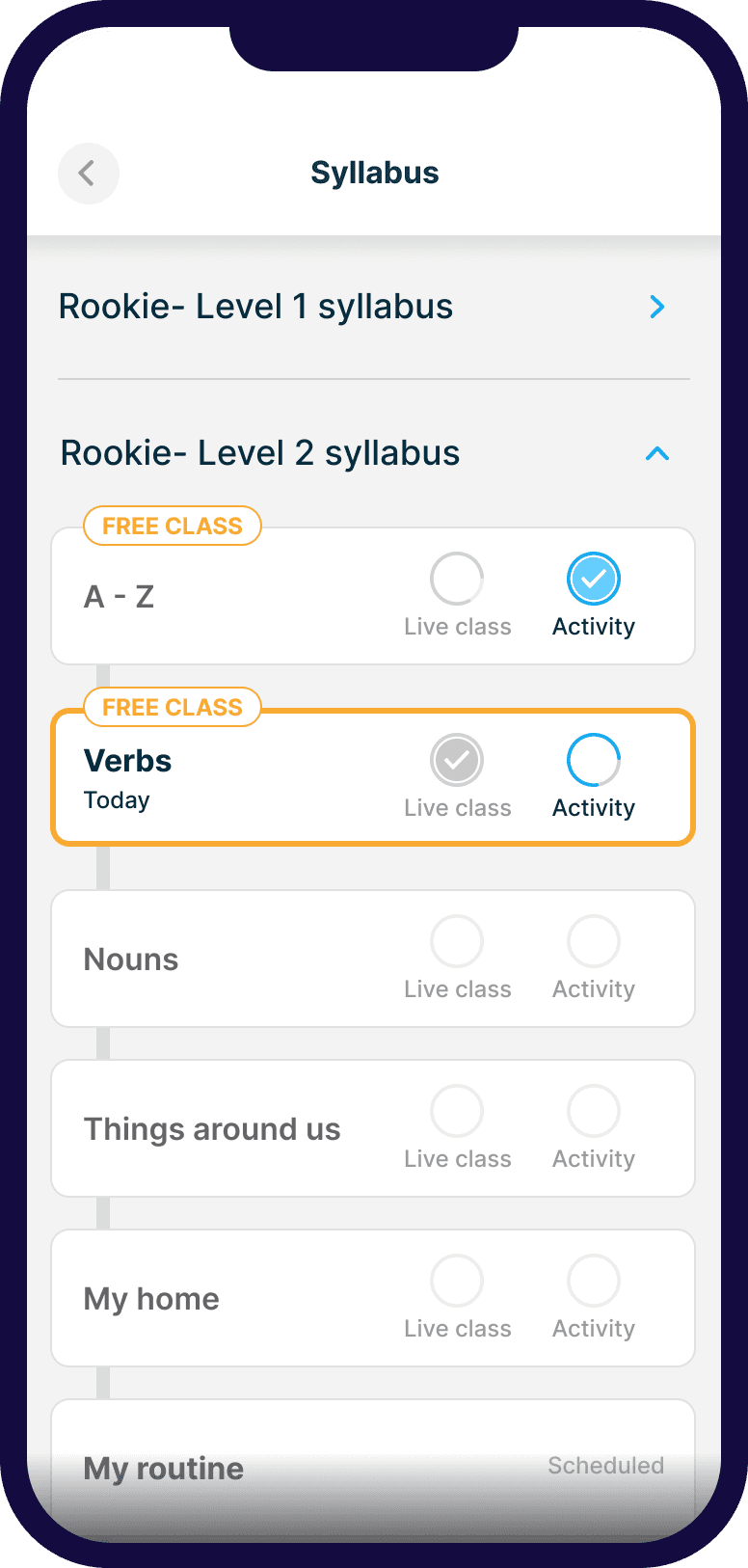 To minimize clutter and reduce choice paralysis on the home screen, the syllabus page is two taps away. It provides easy access to the entire course content, enabling users to navigate seamlessly between lessons.
