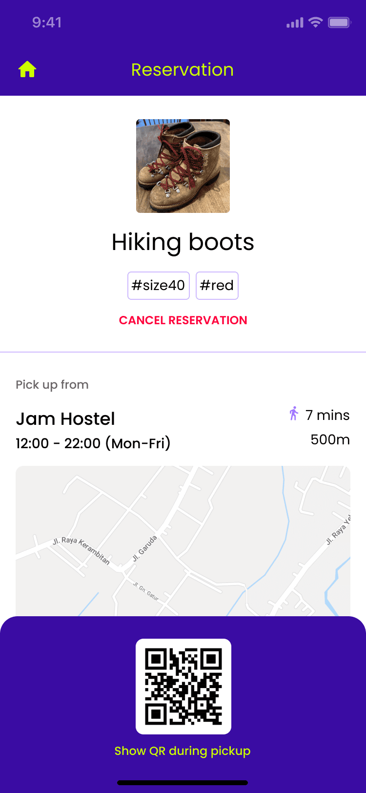 She reserve the boots and gets a unique QR code for the reservation. She has to go pick it up within the next 2 hours of reservation.