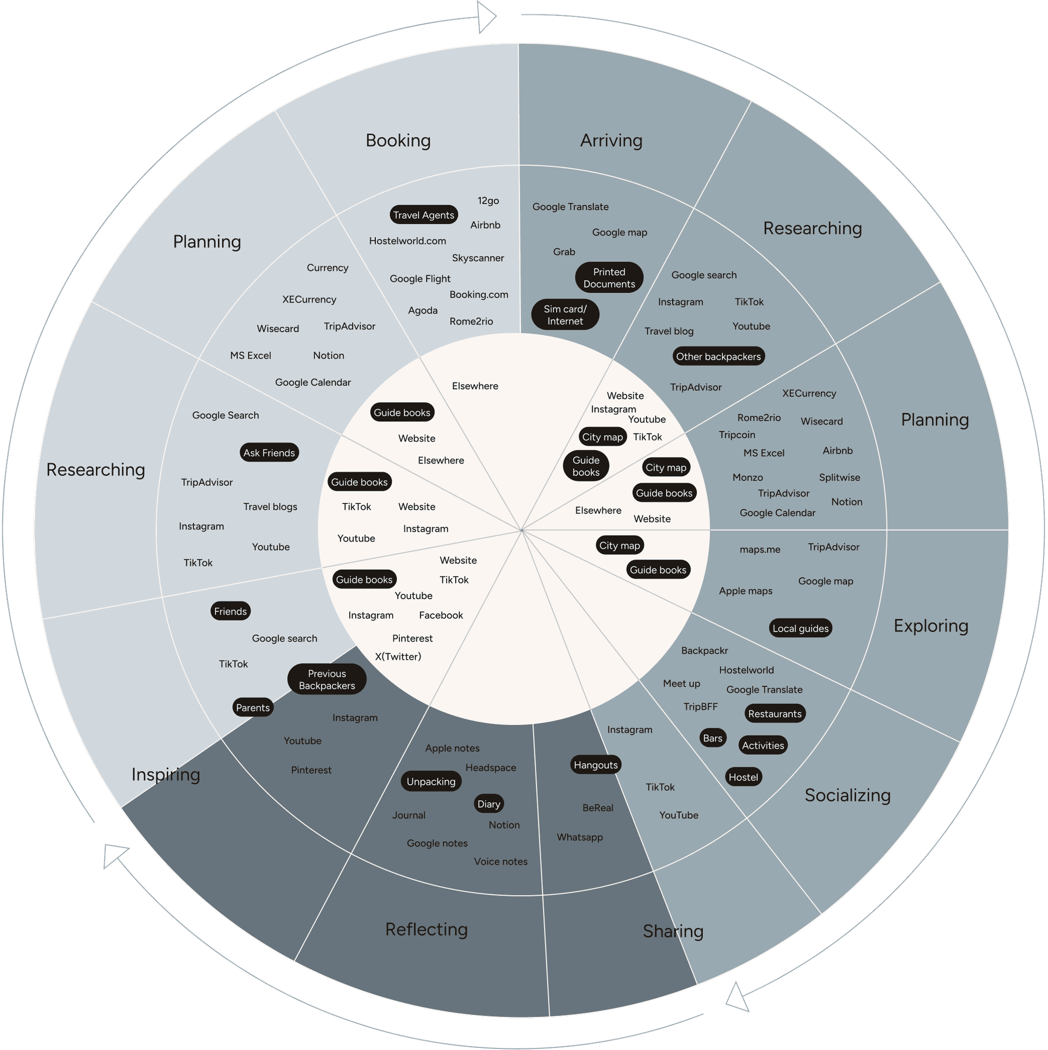 We closely examined a backpacker's travel journey, dividing it into pre-travel, during-travel, and post-travel phases and analyzed all digital and analog tools used during these phases.