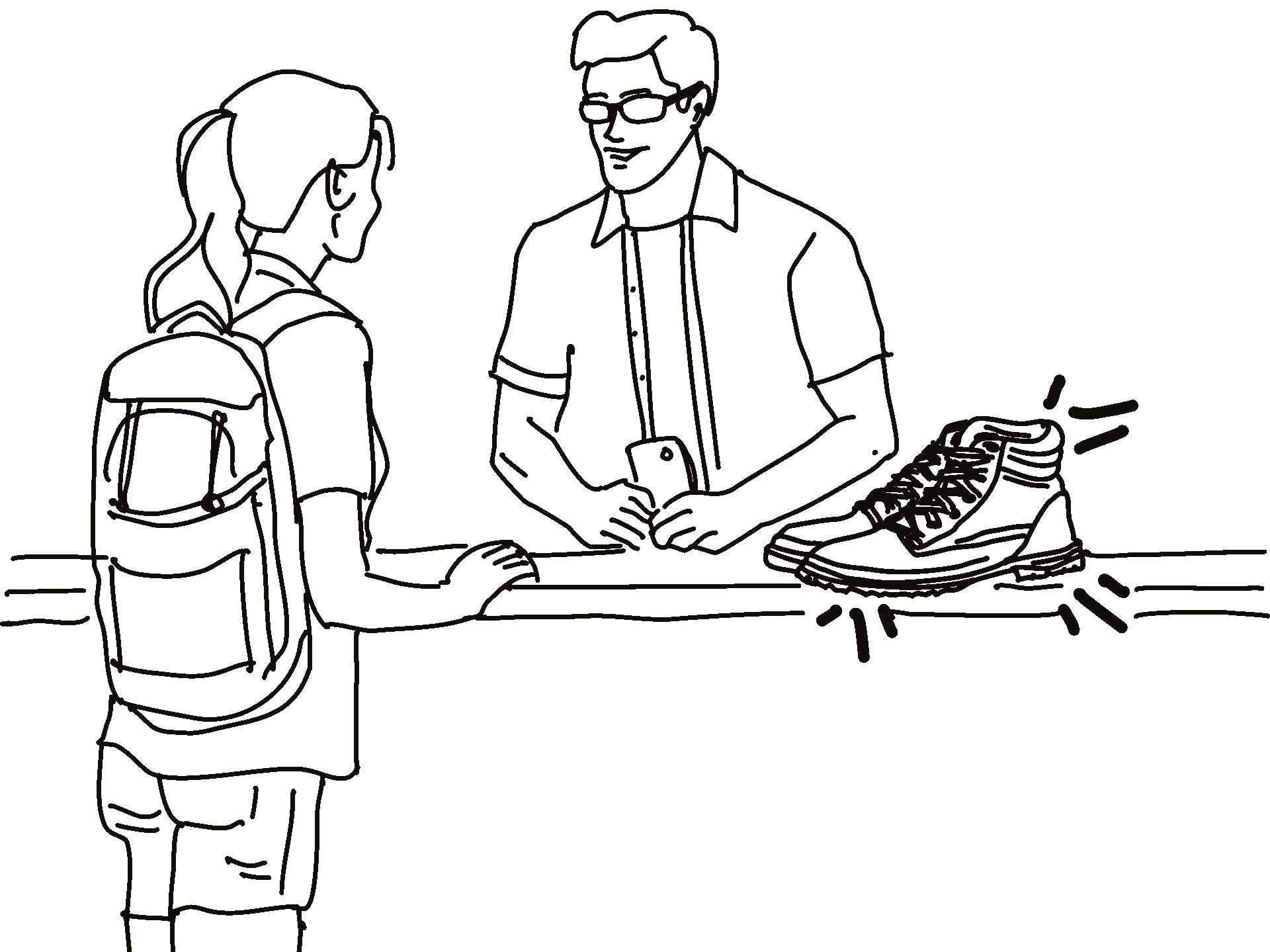 A backpacker leaves behind a pair of hiking boots at Sammy's hostel. Sammy collects the item left behind.